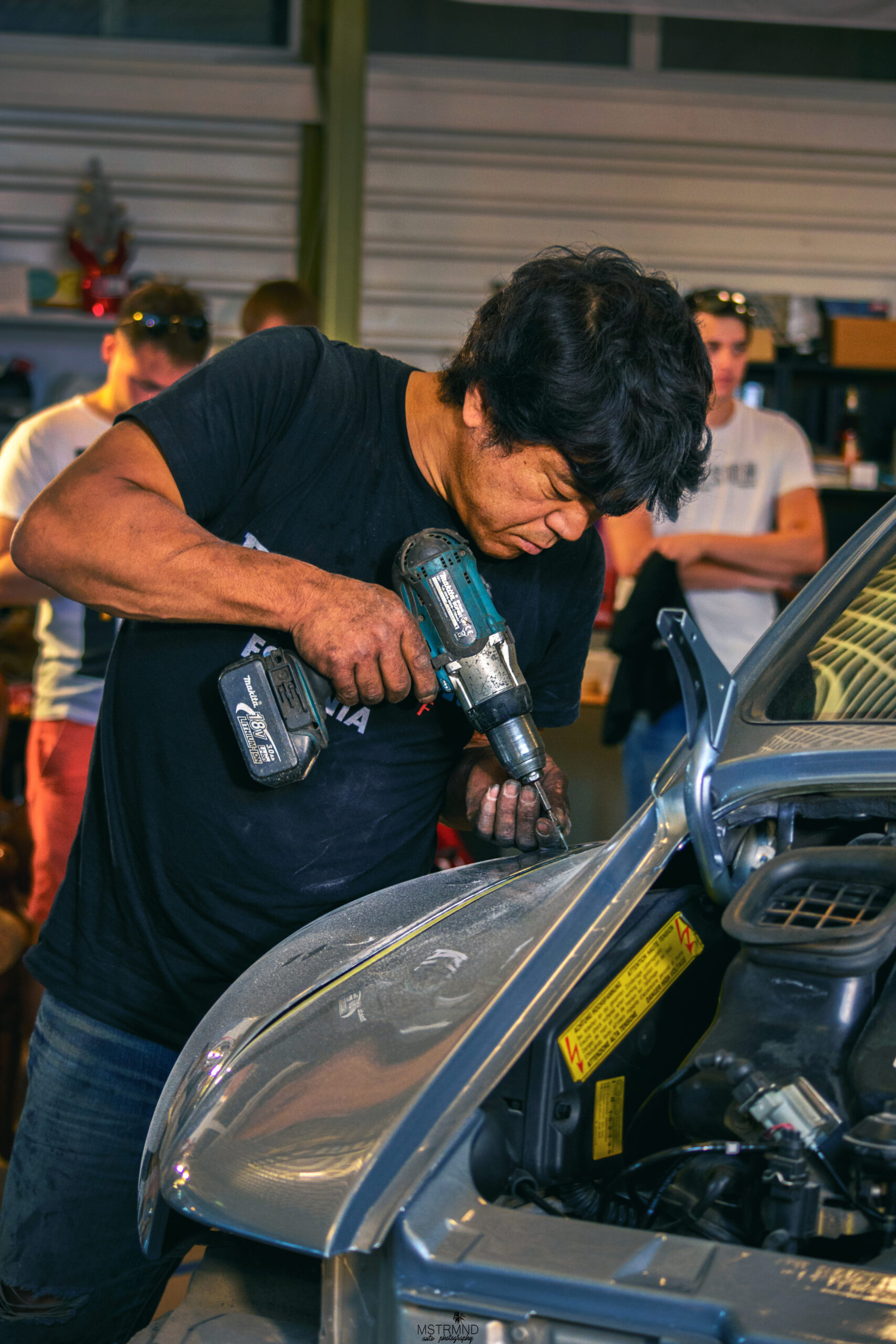 I tried to capture everything – every movement, every angle, every fleeting detail. Hands covered in dust, sparks cutting through air, the growing tension between destruction and creation. That urgency, however, came at a cost. In trying to document everything, I learned an early lesson: not every moment needs to be chased. Some need to be understood first. Over the course of two days, space evolved. What began as something quiet and almost private gradually opened up. More people arrived. Conversations replaced silence. The owner of the car brought food and drinks, and the workshop shifted into something closer to a shared experience.